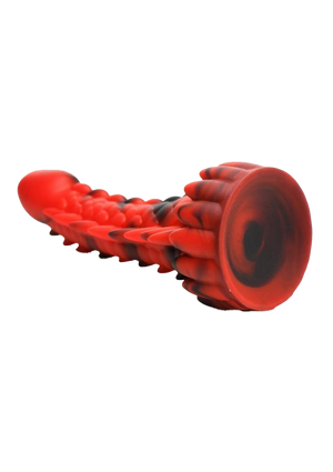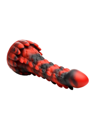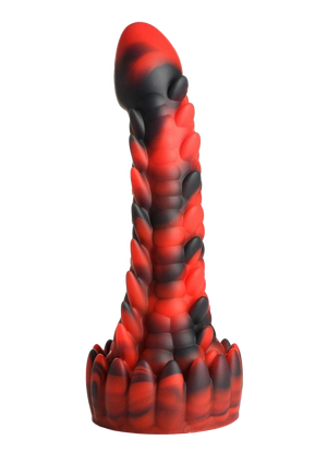 - Dragon Dildo: This red and black dildo is a lean, scaled, fantasy dong! There are four textured rows that run along the sides of the shaft. Three of them are round-nubbed spikes and the third are smooth, round bumps. At the base is a row of upward pointing spikes.