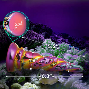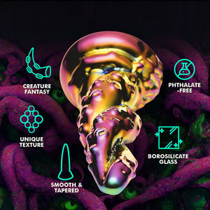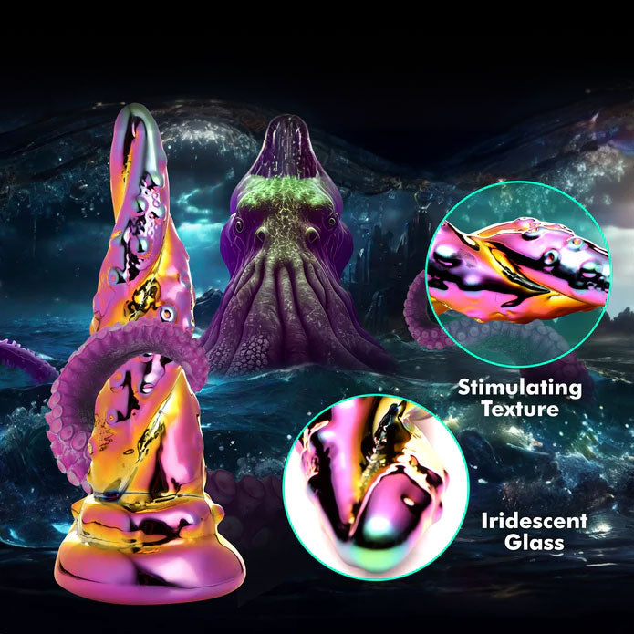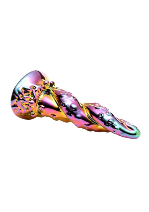 Introduce magic and wonder to your pleasure with the Enchanted Tentacle Glass Dildo from Alien Dildo. Its iridescent, metallic rainbow colors, including bright pink and yellow gold, captivate the eye. Crafted from firm, super smooth borosilicate glass, this high-quality dildo can handle temperature changes for added sensations. The tapered tip ensures easy insertion, while the gradually widening shaft offers a fulfilling experience. Spirals of octopus tentacles with small suckers adorn the shaft, providing stimulating texture with every deep plunge. The flared base allows for compatibility with strap-on harnesses, with soft silicone or rubber O-rings. Avoid using metal O-rings. Dive into a world of fantasy and pleasure with the Enchanted Tentacle Glass Dildo, a unique addition to your collection.