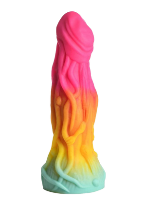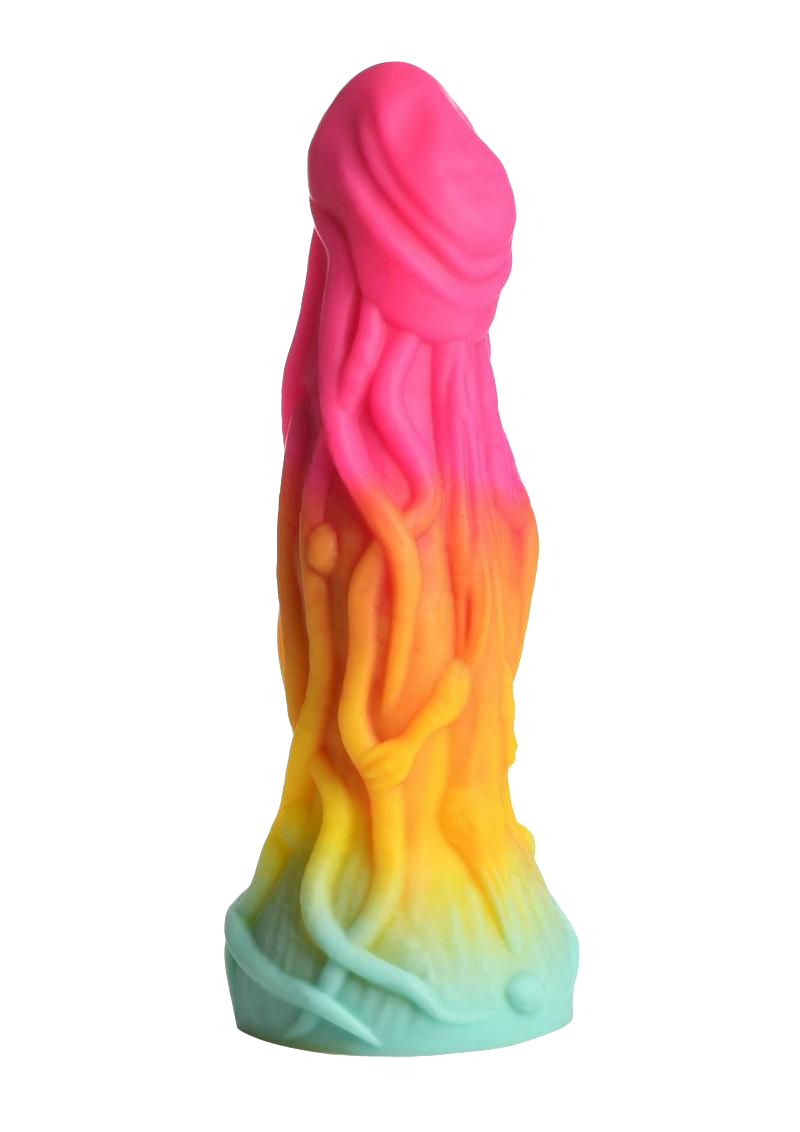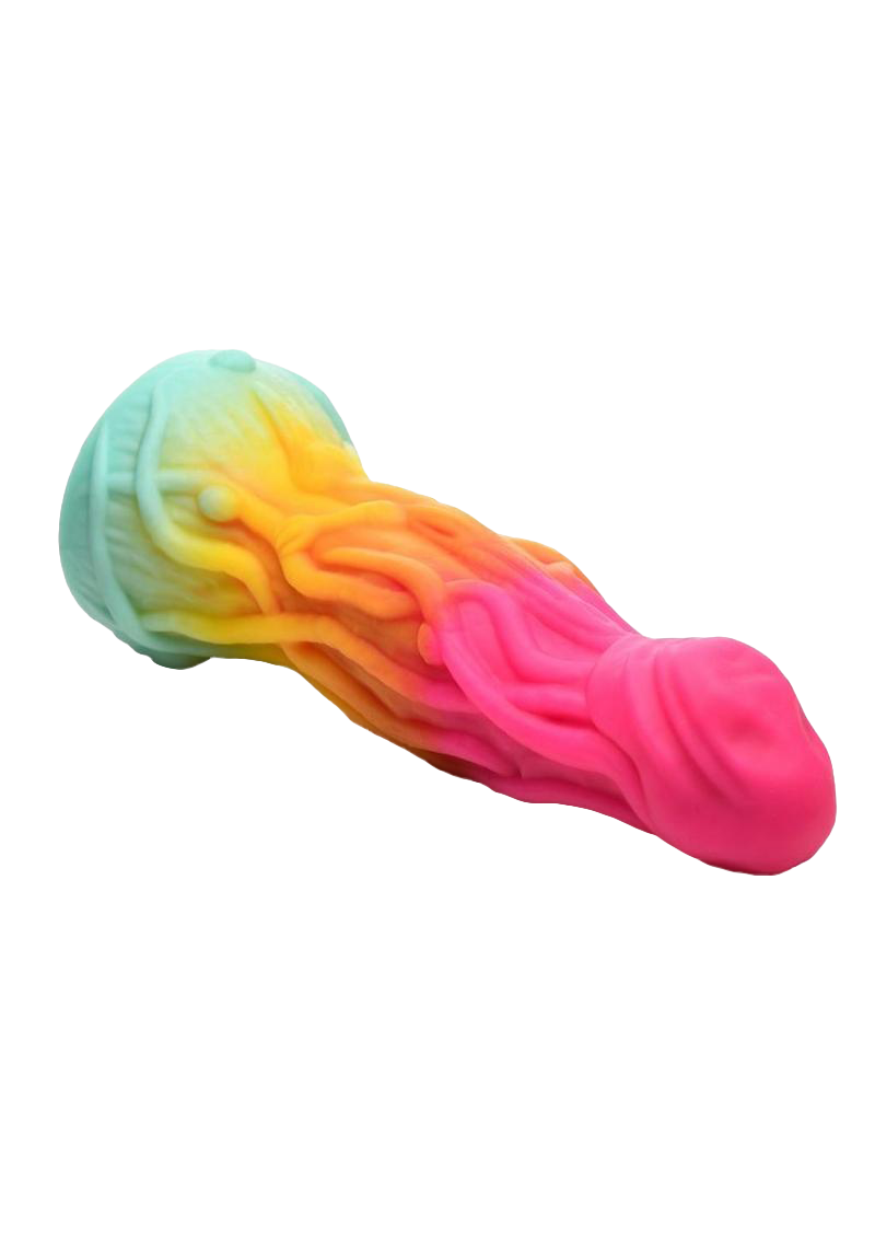- Alien Dildo: This girthy dong is rainbow colored with bright pink, orange, yellow and teal. It is covered in rope-like veins that wrap and cross the shaft. A small, beaked lizard-like creature is hidden amongst the ropey texture.