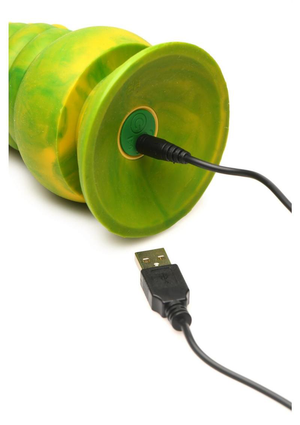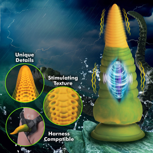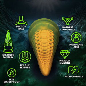 Dive into a sea of pleasure with the Kraken 2.0 Vibrating Tentacle Dildo from Alien Dildo! This vibrant yellow and green tentacle is not just visually stunning but also promises an unforgettable experience. With its impressive size and girth, the tapered tip ensures smooth insertion, followed by a deep, satisfying stretch as you fill yourself with this firm yet squishy toy. The uniquely textured shaft, covered in stimulating suckers, offers sensational stimulation in ways you've never felt before!