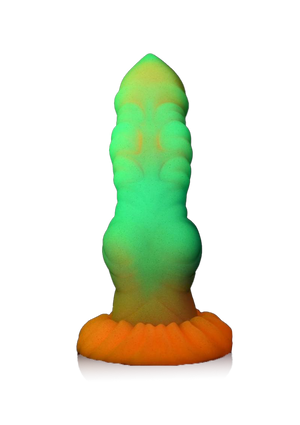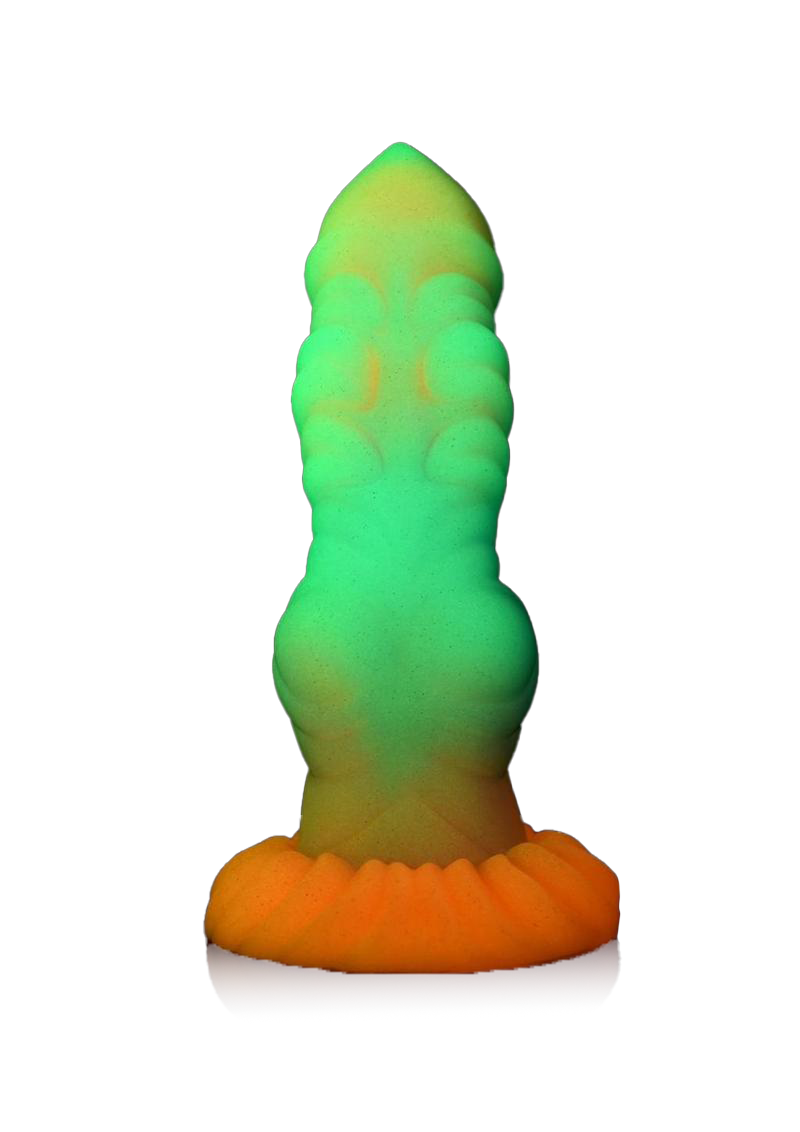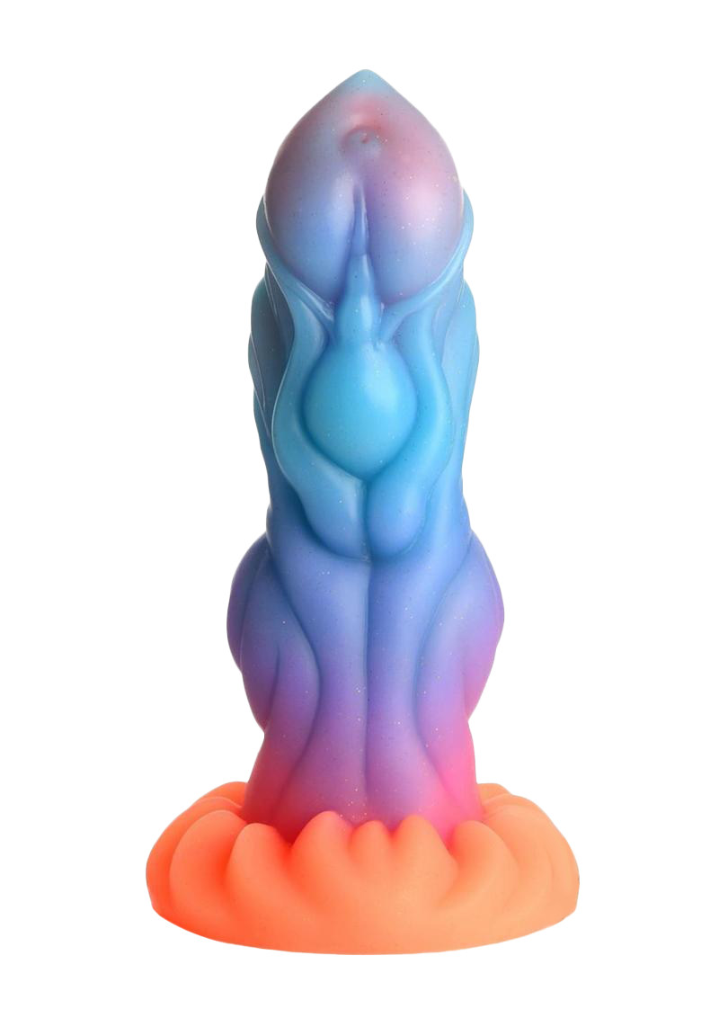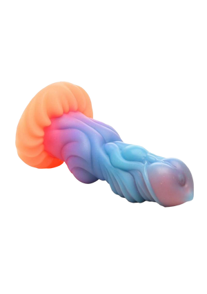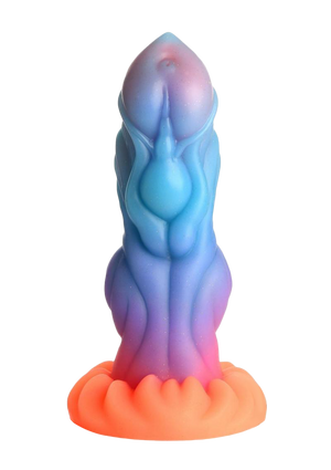 Immerse yourself in an otherworldly delight with the Shapeshifter Alien Dildo! This mesmerizing beast is designed to captivate your senses. Its glow-in-the-dark rod illuminates the night, while its extraterrestrial form sends shivers of pleasure down your spine. Crafted from premium, phthalate-free silicone, this body-safe dildo features a firm core and a soft exterior, allowing it to squeeze into your tightest spots. With a stunning sunburst of layered blues, oranges, pinks, and purples, and shimmering glitter scattered throughout the shaft like stars in the sky, it's a visual feast. The pointed tip effortlessly glides inside, leading to an exploration of massive bumps, ridges, ribs, and textured forms that provide a unique and otherworldly sensation as you ride. The wide, flanged base not only offers stability but also functions as a suction cup for hands-free enjoyment. For added excitement, pair it with a strap on harness and indulge in kinky cosplay or alien abduction roleplay. Experience pleasure from another dimension with the Shapeshifter Alien Dildo!