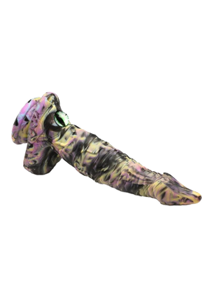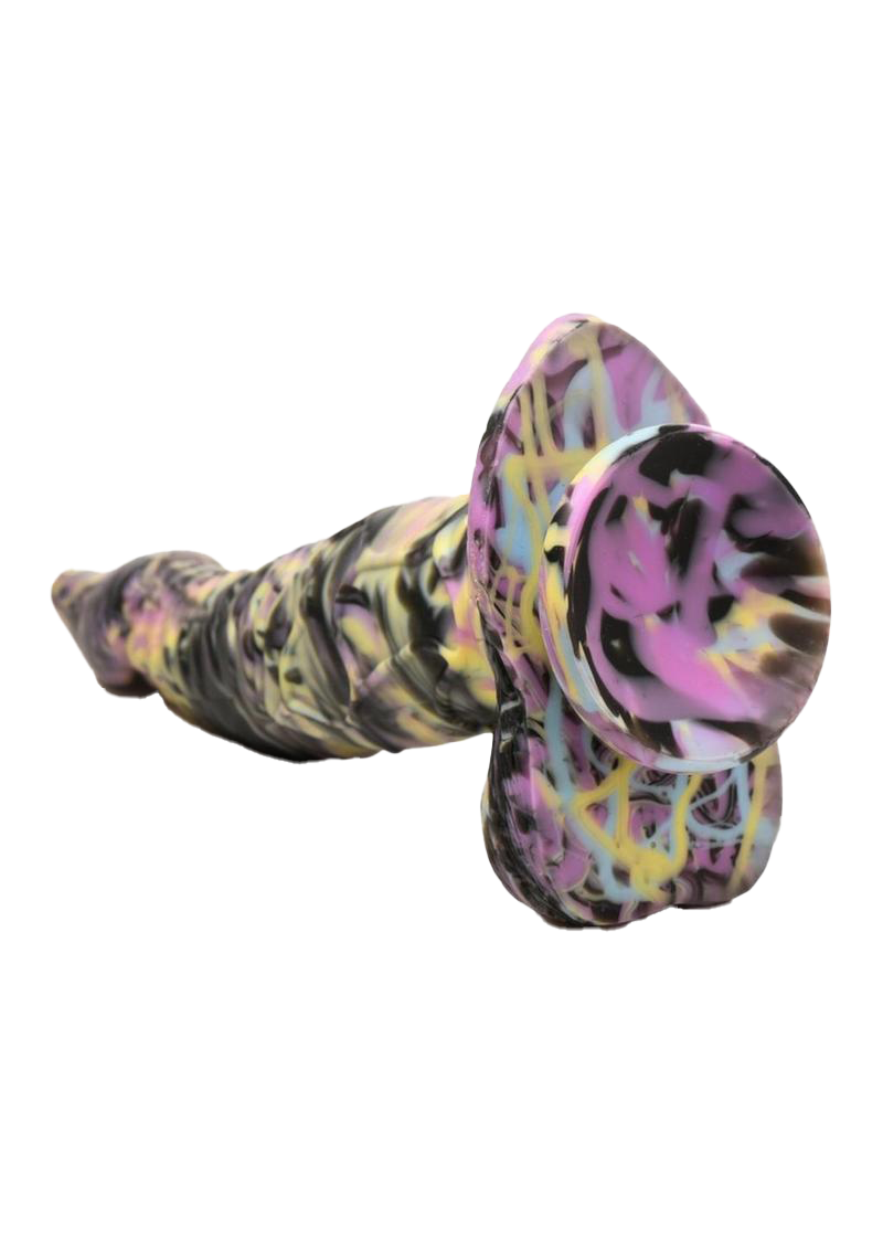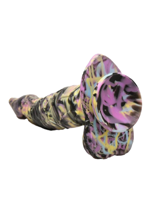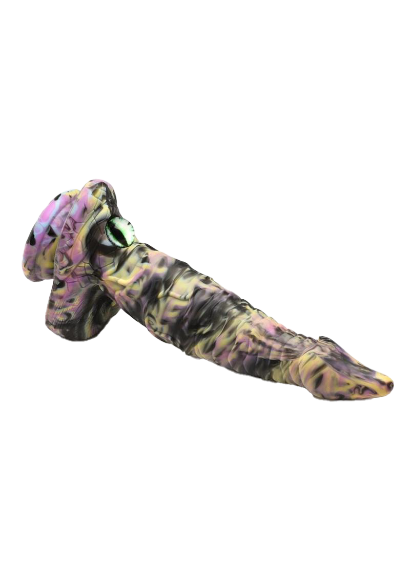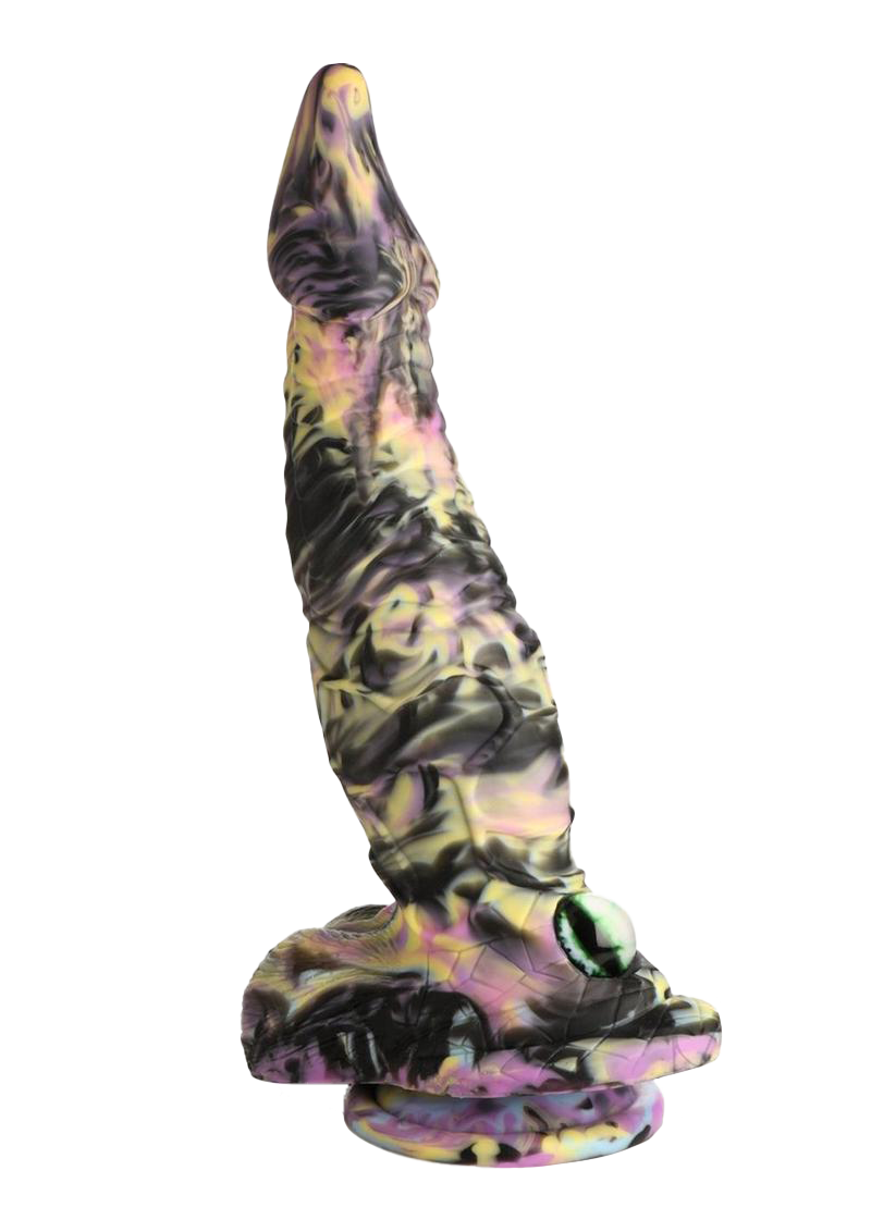 - Fantasy Sex Toy: This black, pink, and yellow dildo features a long tapered tip, a ribbed shaft pulsating with large veins, and a base with one glass eye looking back up at you.
